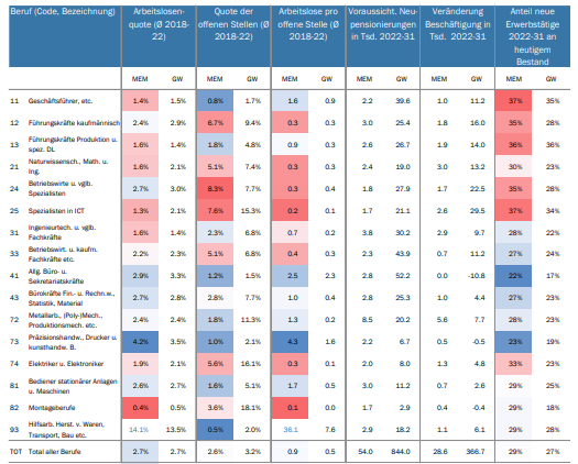 sind die absoluten Zahlen der Neupensionierungen und Veränderung der Beschäftigung 2022-2031 ebenfalls in der Tabelle enthalten.Auf Basis dieser Indikatoren lassen sich unter anderem folgende Erkenntnisse zum
